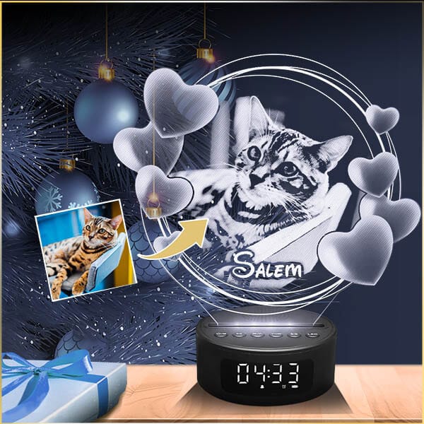Composé d’une base LED illuminée et d’une plaque en plexiglas gravée et découpée au laser qui s’insère dans la base, la photo gravée s’illumine pour donner un effet hologramme impressionnant !